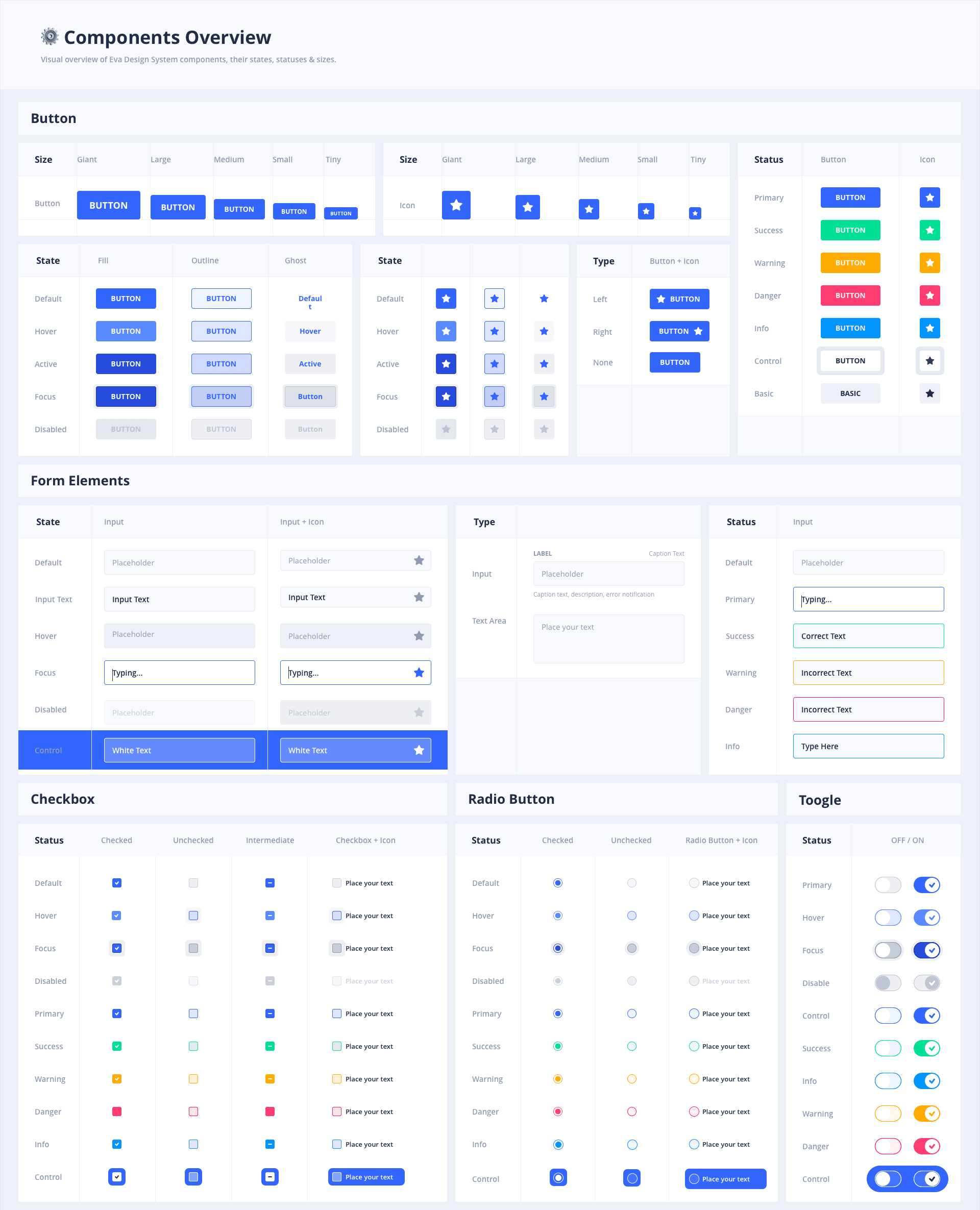 A Design System is a fairly new concept, but it is already quite widespread across large organizations. Developing a design system for your organization can be quite a time- and money-consuming task, but Eva Design System can help you save here. It comes with the idea of customization as its core concept, this is why adjusting Eva to fit your brand is fairly easy. Besides that, Eva comes with a set of great tools and practices to set up the right process of UI development inside your organization.